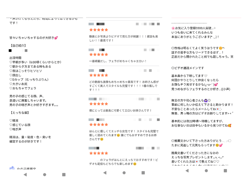 「見つめながらフェラするのが好き」「おもちゃでフェラしてます」みたいな内容をプロフィールに書いている子を、ひたすらお気に入り登録しました。実際にエロチャットを体験した男性の「女の子推薦文」も参考になりますね。