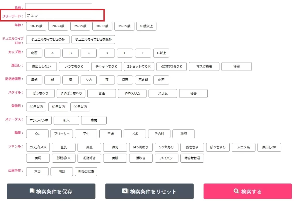 チャットレディサイトによって、フェラができる女性の探し方は異なります。例えばジュエルライブやマダムライブの場合は、フリーワード検索から探すことが可能です。